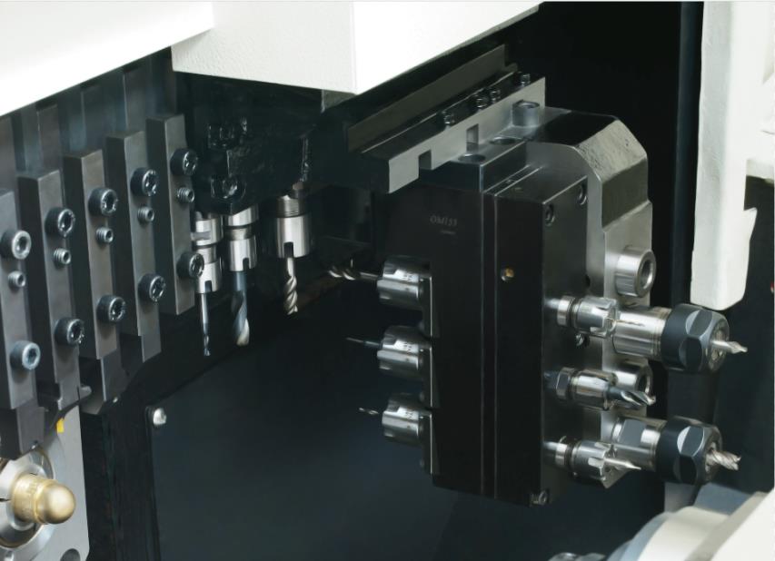●刀排結(jié)構(gòu)采用了階梯式導(dǎo)軌構(gòu)造,提高刀架臺剛性,排屑順暢,配置有側(cè)銑動力刀具和主軸分度功能,可以滿足復(fù)雜的車、銑、鉆復(fù)合加工的需求。